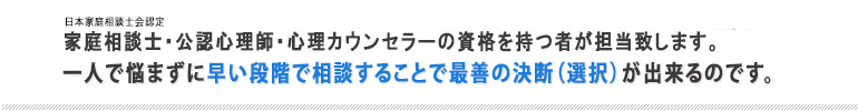 ※あくまでも中立の立場であり相談員(家庭相談士)としての関与ですので代理人とは異なります、法律論や相手方を説得する行為、その他、法律事務は行っておりません。また、一方的な説得や法的に相手方を責める行為、弁護は行えません。
